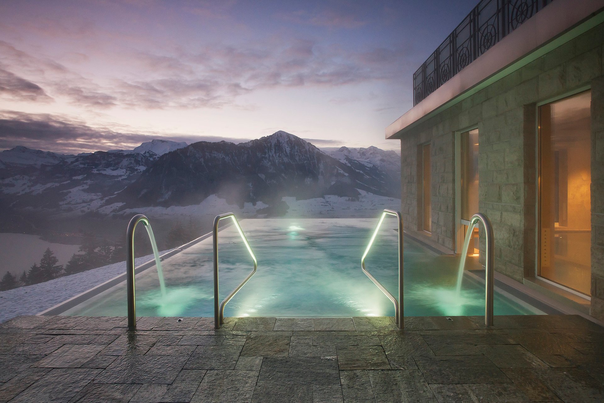 The hotel offers incredible spa facilities. There is an indoor pool serenaded by underwater music, a Finnish sauna and steam bath, plus an especially beautiful outdoor infinity pool with views over the lake.